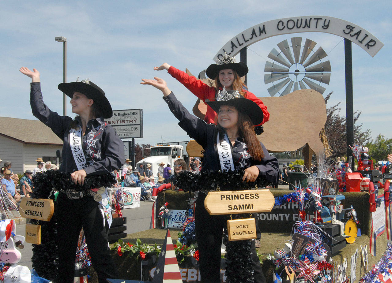 Clallam County Fair Royalty, from left, Princess Rebekah Parker, Queen Saydee Peters and Princess Sammi Bates wave from their fair float on Saturday. (Keith Thorpe/Peninsula Daily News)