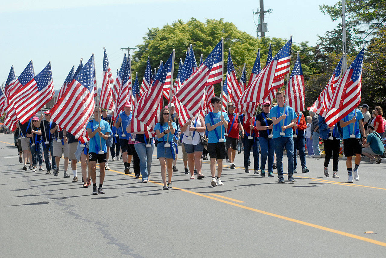 A forest of American flags highlight a parade entry for the Rotary International Neighborhood Flag Display project. (Keith Thorpe/Peninsula Daily News)