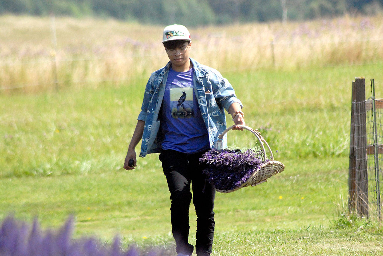 William Tang of Fat Cat Garden and Gifts carries a basketful of hand-picked lavender to the farm’s gift shop Friday. (Keith Thorpe/Peninsula Daily News)