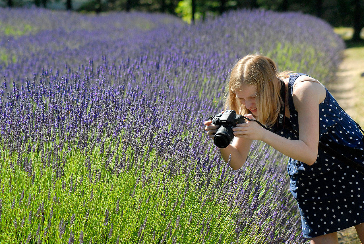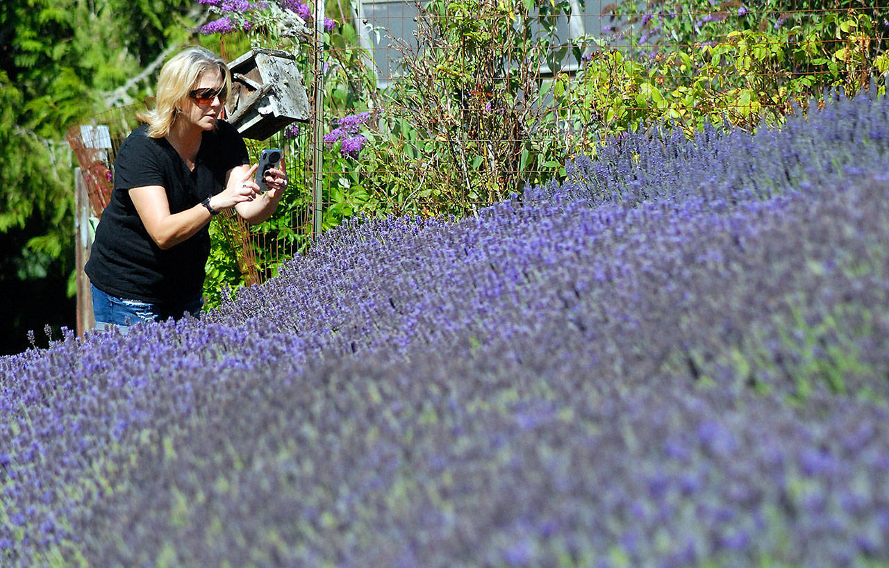 Dawn James of Graham takes a photo of a row of lavender at Nelson’s Duckpond and Lavender Farm on Saturday. (Keith Thorpe/Peninsula Daily News)
