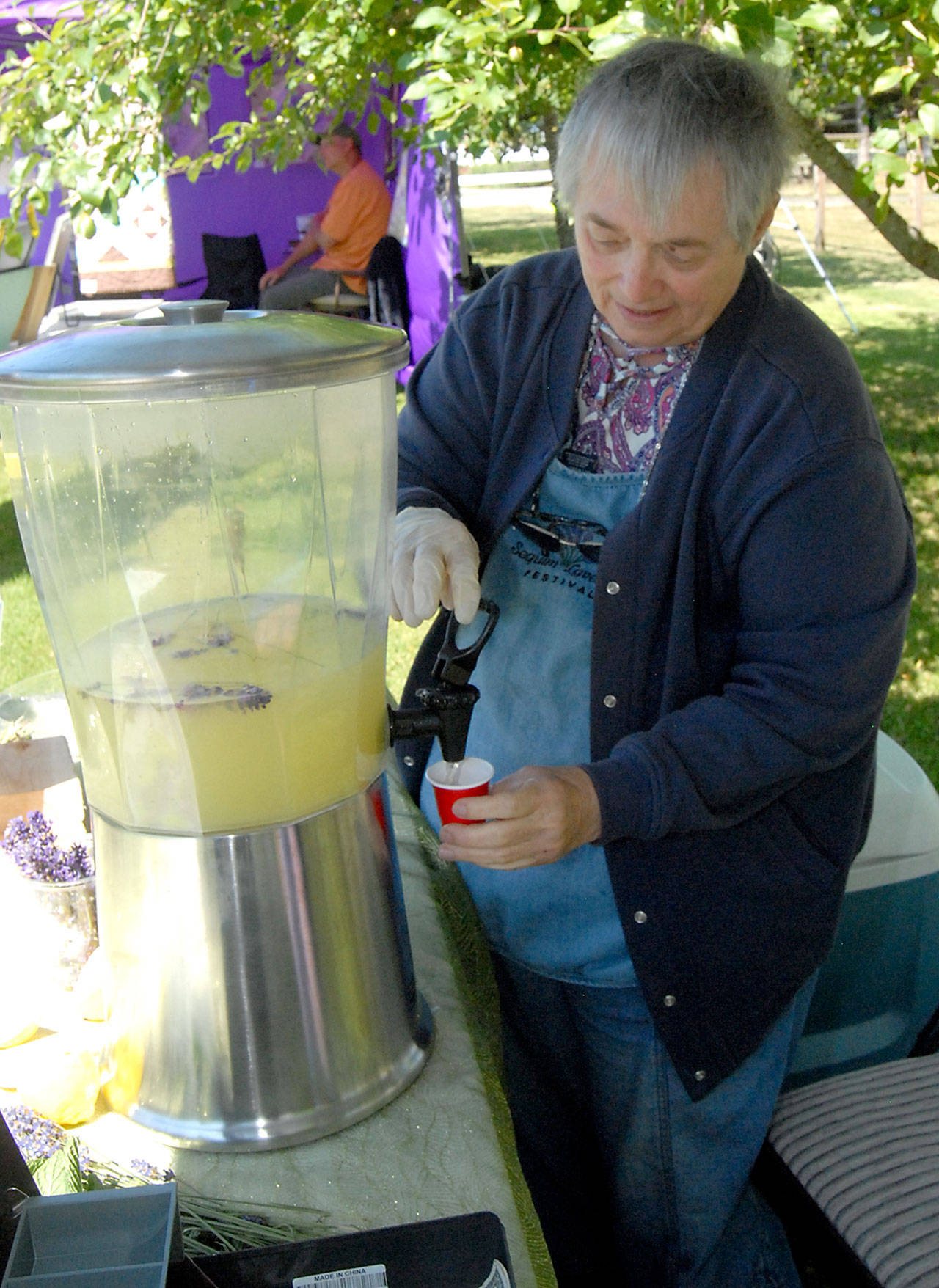 Kitty B’s Lavender Farm volunteer Lynda Tripp pours a sample of lavender lemonade Saturday during Lavender Weekend. (Keith Thorpe/Peninsula Daily News)