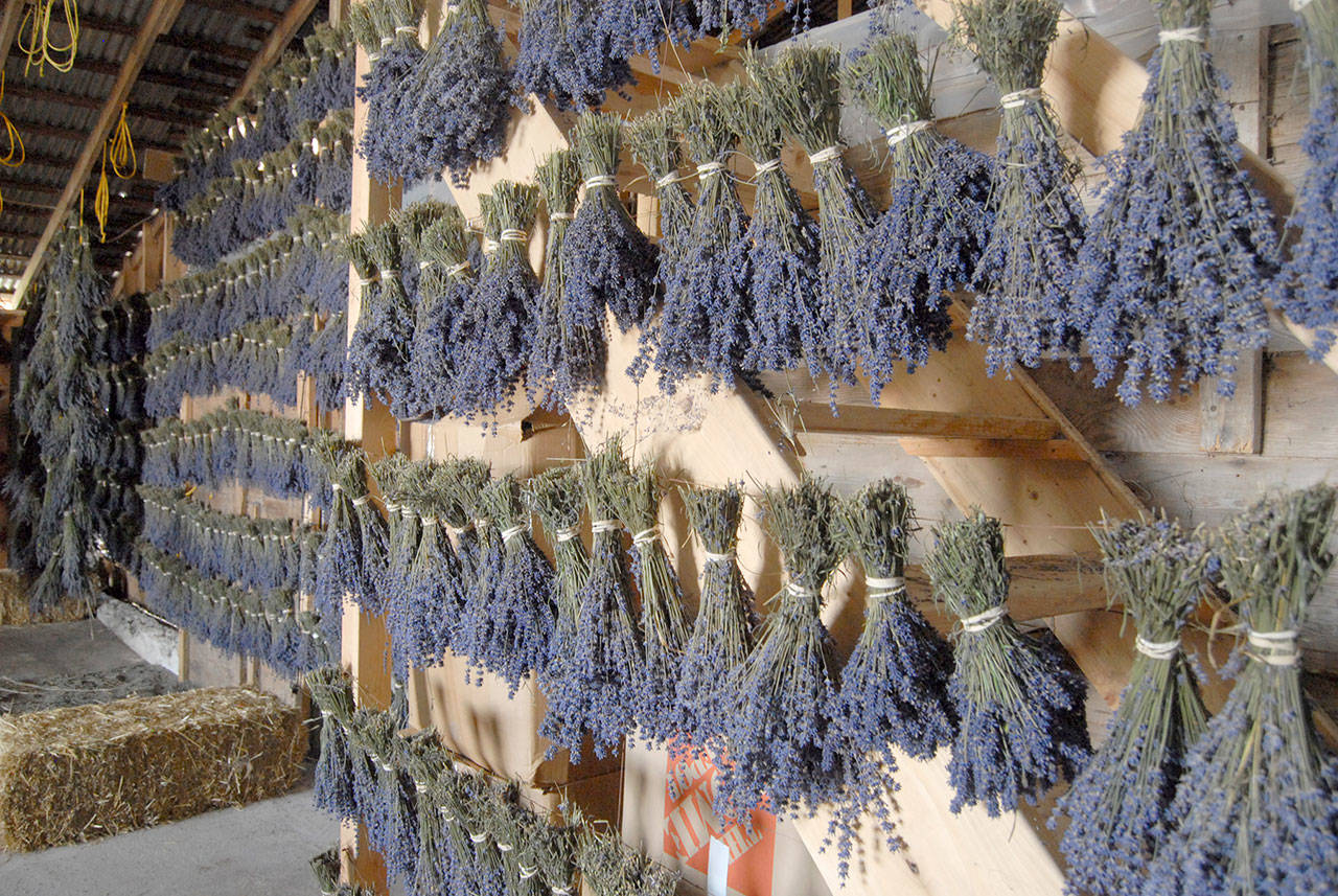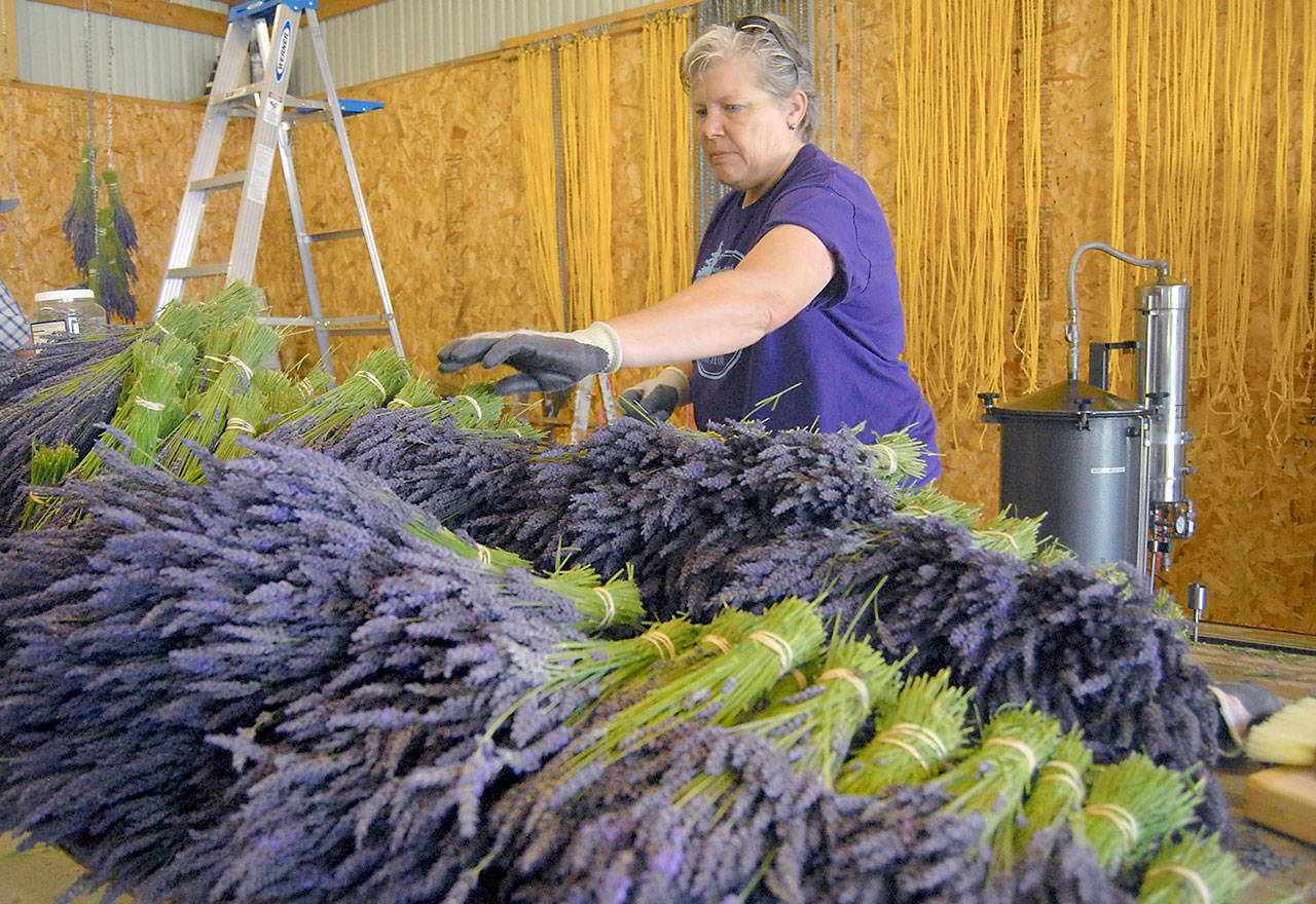 Volunteer Liz Diesner of West Seattle sorts bundles of lavender ready for drying Saturday at Kitty B’s Lavender Farm west of Sequim. (Keith Thorpe/Peninsula Daily News)