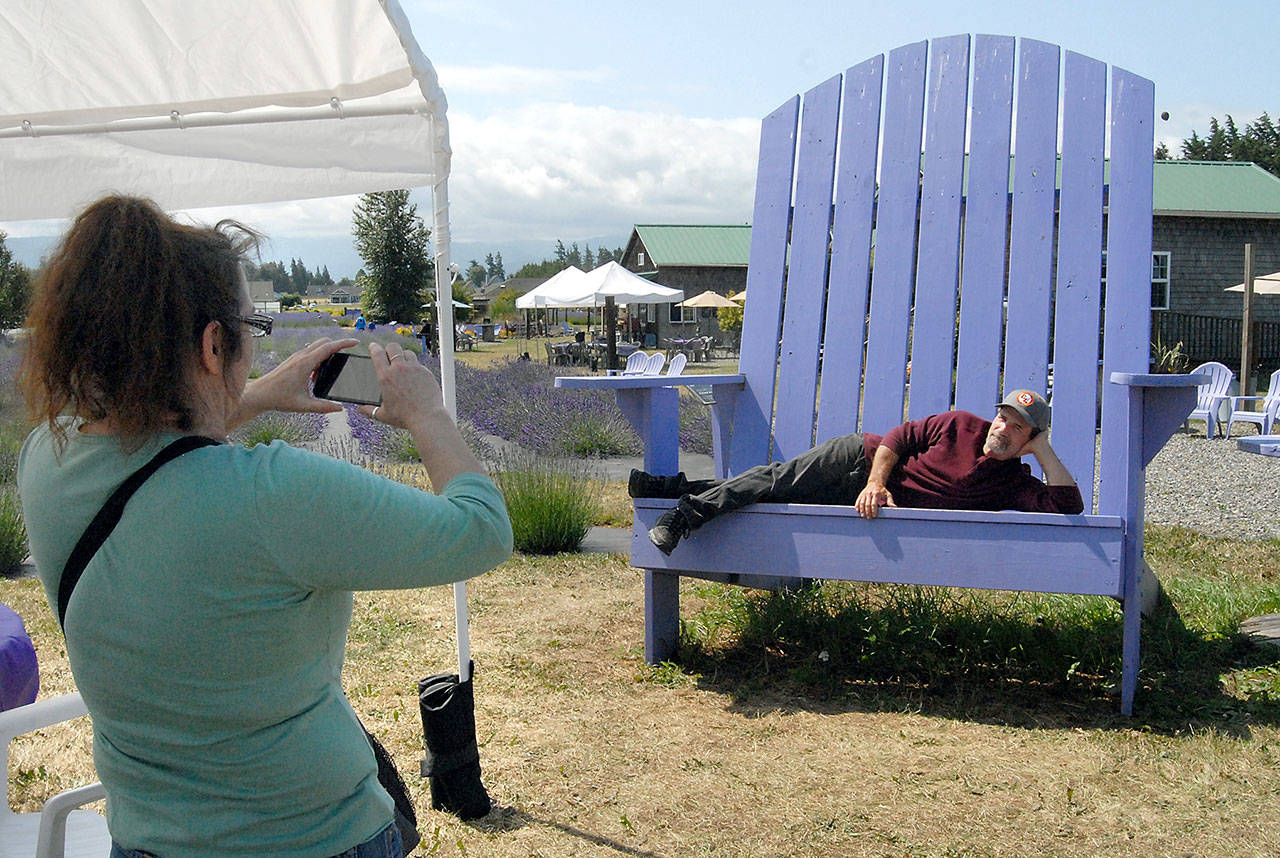 Brian Morrow of Omaha, Neb., lies in an oversize chair as his wife, Tammie Morrow, takes a cellphone photo at Olympic Lavender. (Keith Thorpe/Peninsula Daily News)