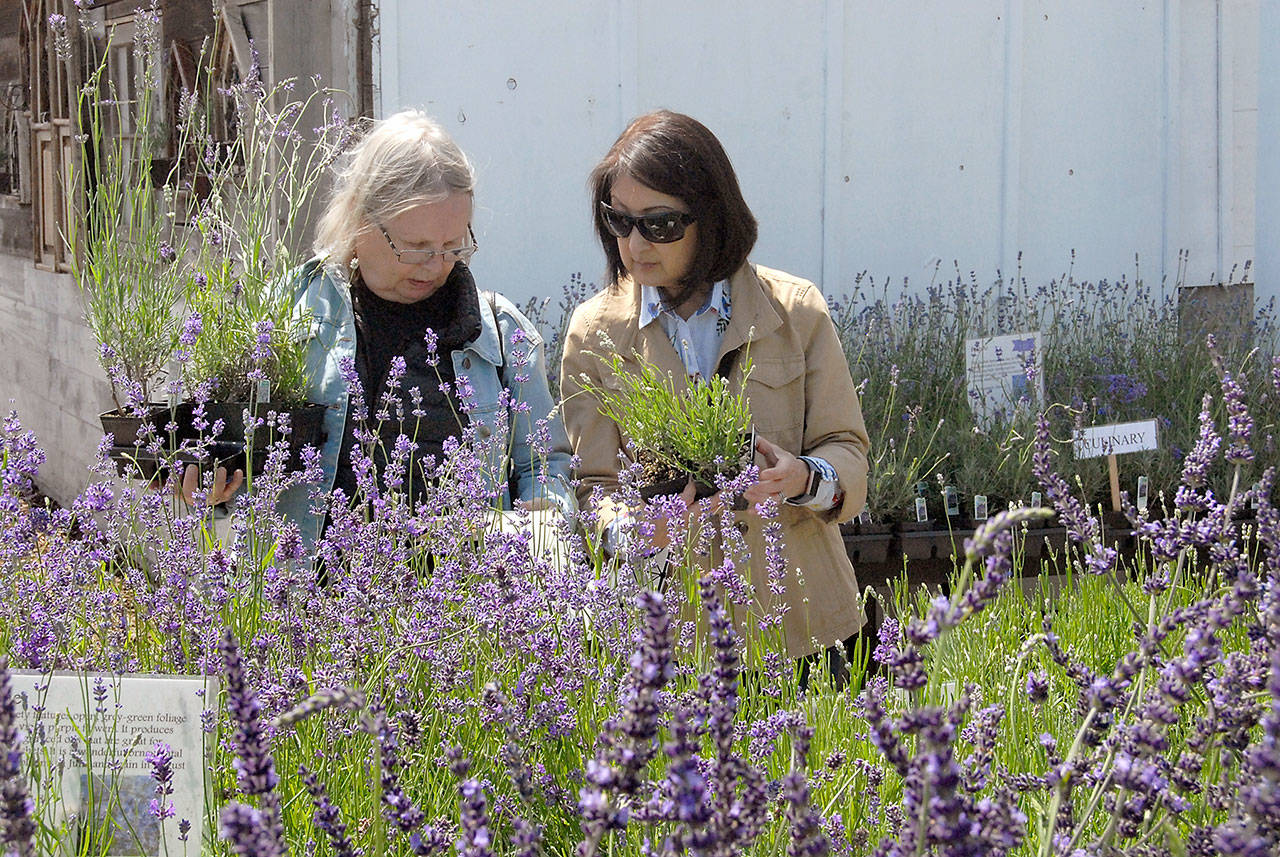 Vikki Pearce of Duvall, left, and Clara Lamantea of Redmond consult a list as they consider purchasing lavender plants on Friday at Victor’s Lavender. (Keith Thorpe/Peninsula Daily News)