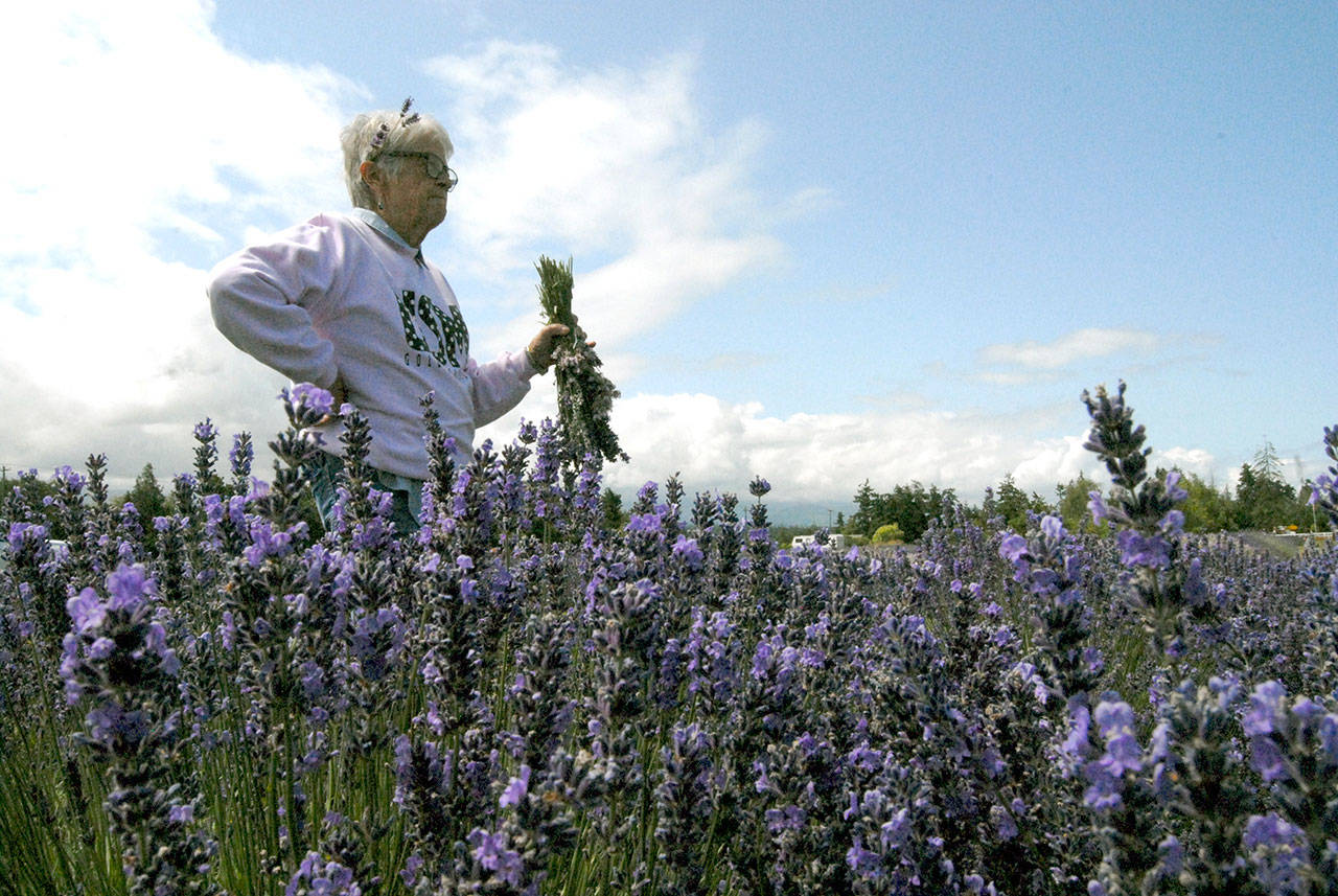 Mae Bozeman of Flora, Miss., holds a bundle of lavender she picked Friday at B&B Family Farm. (Keith Thorpe/Peninsula Daily News)