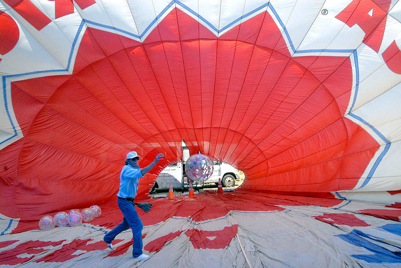 Jeff Terry, crew chief with the Dream Catcher Balloon project, tosses a ball in front of a fan used to inflate a decommissioned hot air balloon set up as a bounce house at the Olympic Lavender farm. (Keith Thorpe/Peninsula Daily News)