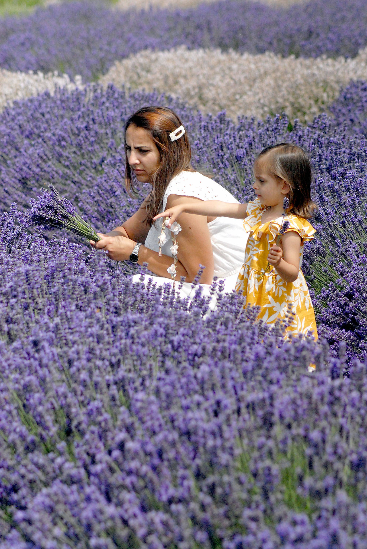 Stana Manole and her daughter, Emma, 2, both of Seattle, look over rows of lavender at B&B Family Farm. (Keith Thorpe/Peninsula Daily News)