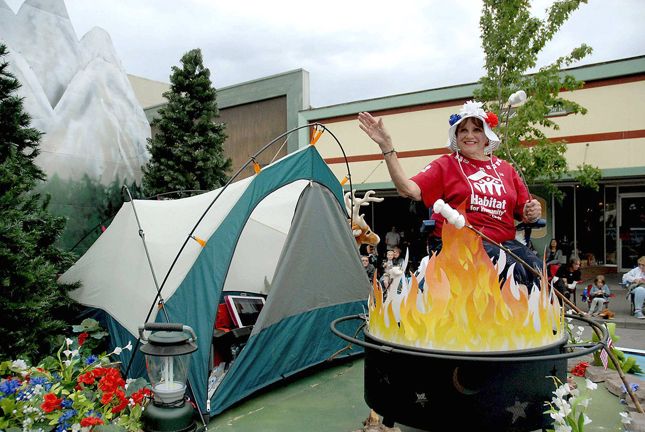 Sharon Oppenheimer sits in a camping scene on a float sponsored by Habitat for Humanity of Clallam County during Wednesday’s parade in Port Angeles. (Keith Thorpe/Peninsula Daily News)