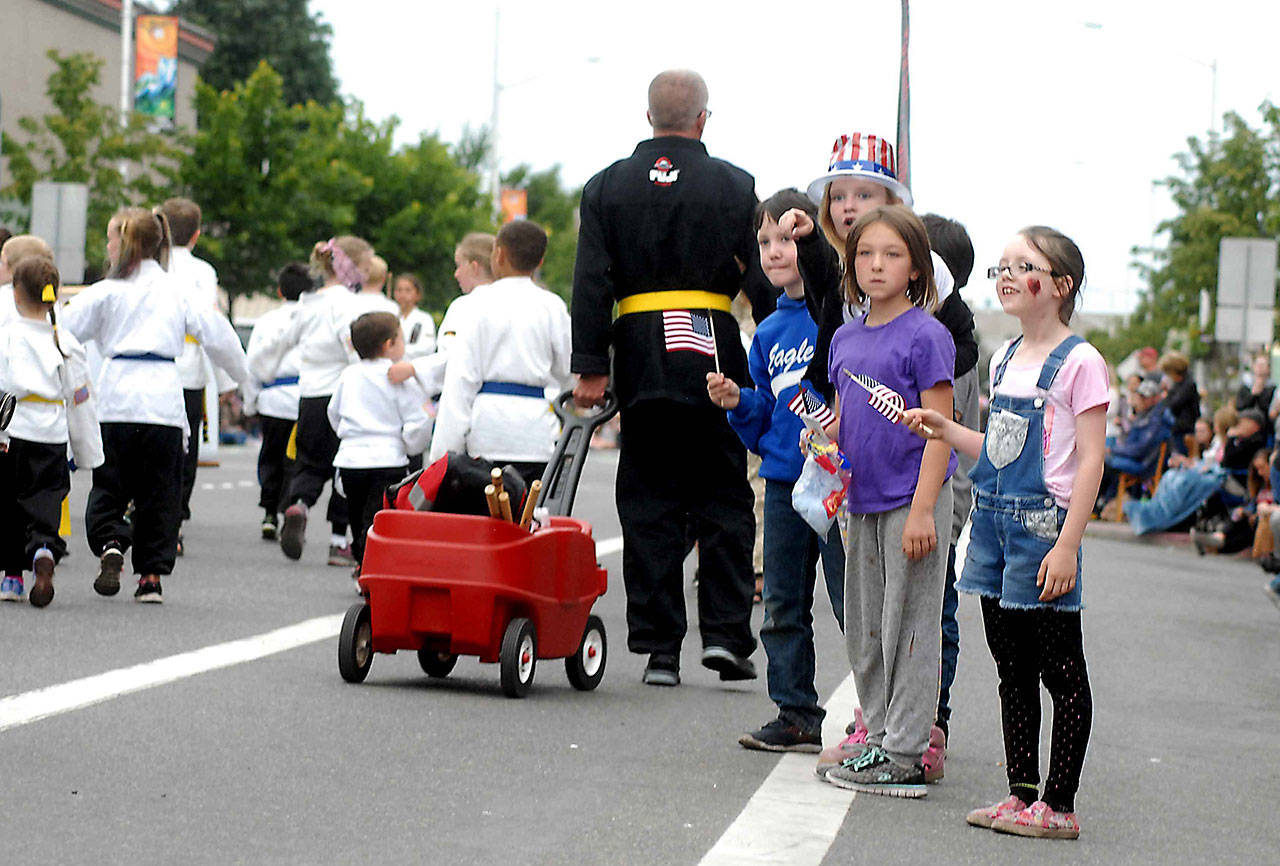 Parade-goers, from left, David Warwiuck, 8, Summer Sellers, 9, Gracie Shabel, 10, and Chloe Warwick, 7, watch the Port Angeles Independence Day parade as a contingent from Phoenix Dragon Martial Arts Hapkido & Fitness pass by Wednesday. (Keith Thorpe/Peninsula Daily News)