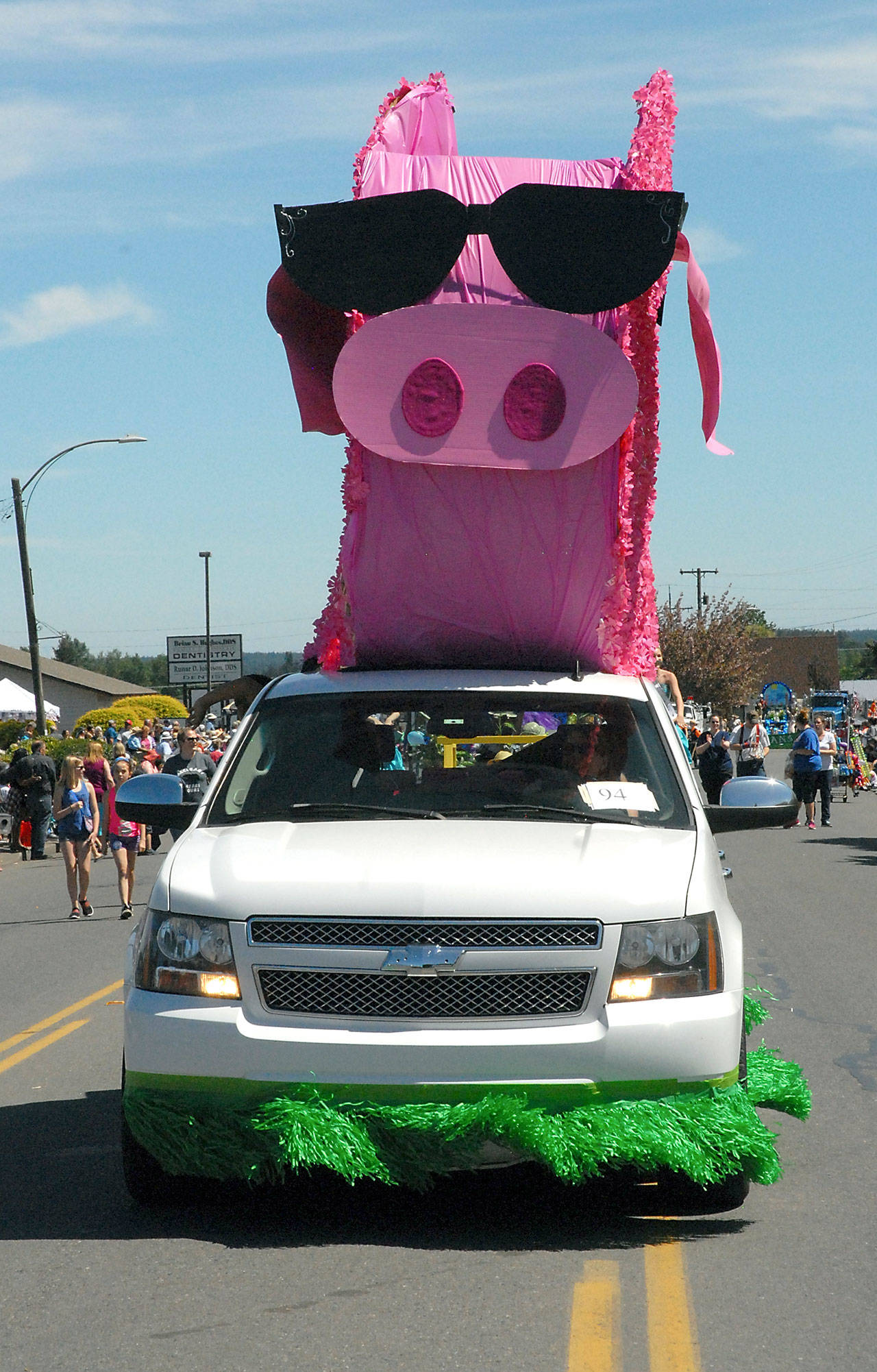 A giant pig adorned with sunglasses makes its way down the parade route Saturday. (Keith Thorpe/Peninsula Daily News)