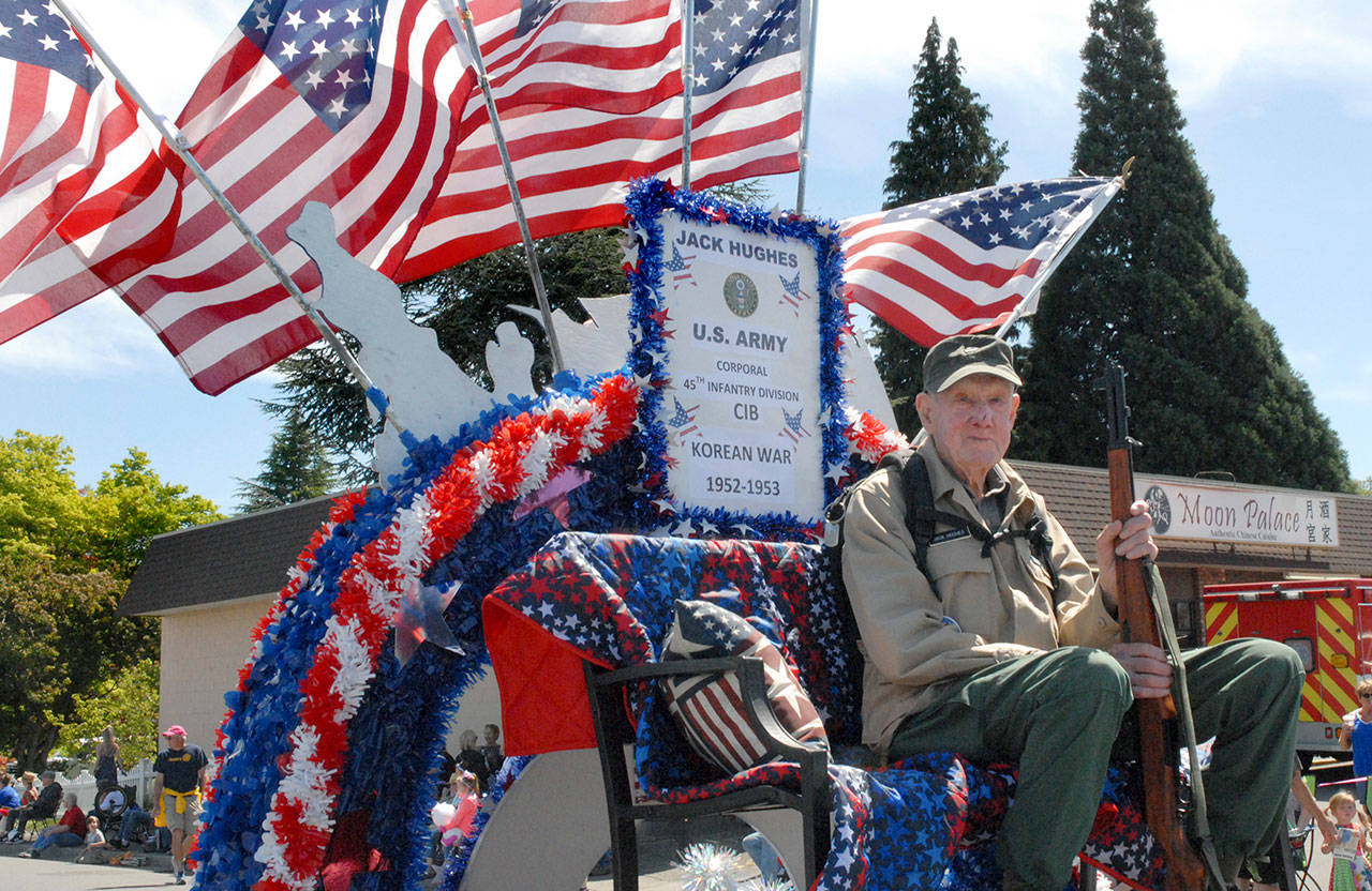U.S. Army Korean War veteran Jack Hughes of Port Angeles, a long-time ranger for Olympic National Park, rides as guest of honor on the Forks Old Fashioned Fourth float on Saturday. (Keith Thorpe/Peninsula Daily News)