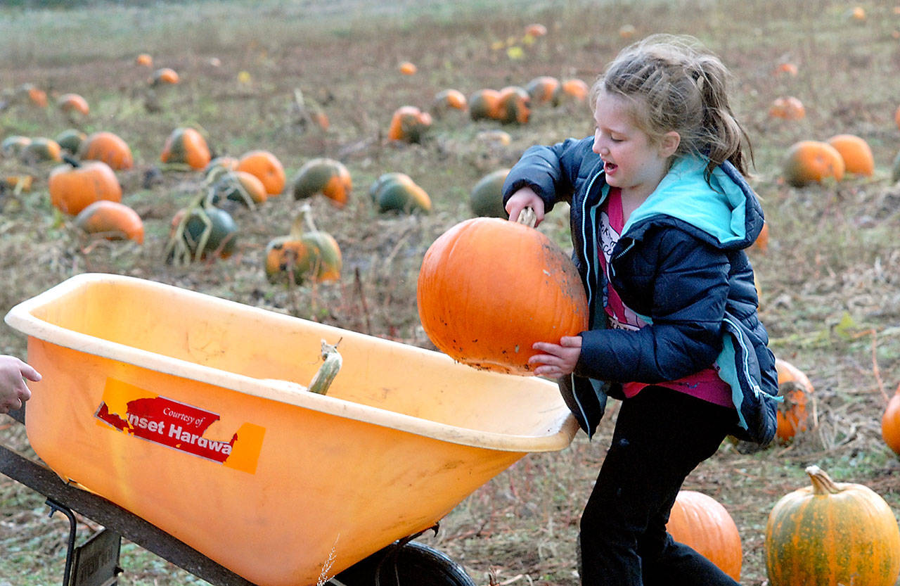 Below, Lacie places her pumpkin of choice in a wheelbarrow at the Sequim Pumpkin Patch.