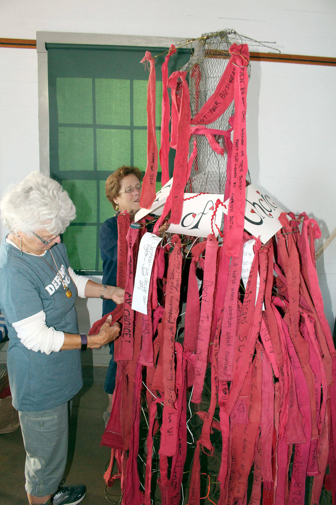 Above, artist Judith Bird, left, helps Katherine Camacho Carr attach her contribution to “Our Lady of Choice” — a community art piece created by Bird, Margie McDonald and community members for Monday’s Port Townsend event on National Women’s Equality Day.