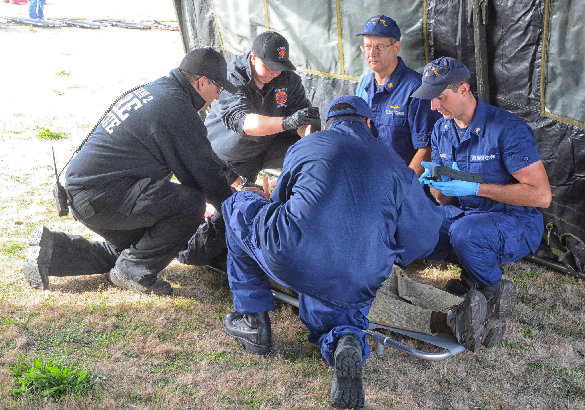 Once agencies returned to the Coast Guard station with suits that simulated victims, actual people with simulated injuries filled in.