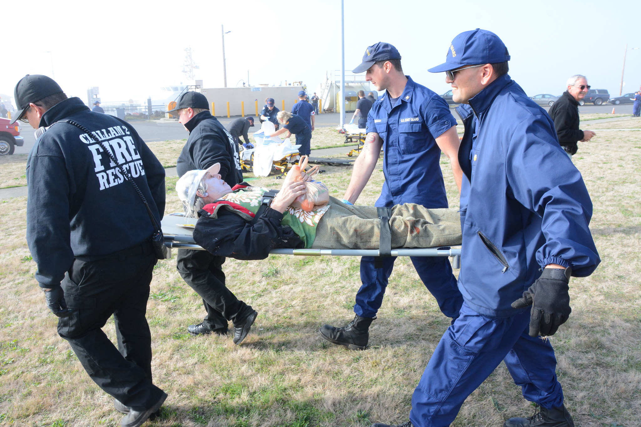 The Coast Guard worked with several local agencies Tuesday — including law enforcement, firefighters and paramedics — as well as Canadian first-responders to simulate rescuing 60 people from the Strait of Juan de Fuca after a maritime disaster about six miles north of Port Angeles.