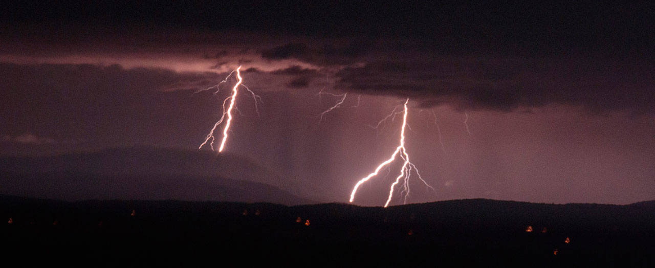 Below, Sequim resident Witta Priester sent in this photo looking over downtown Sequim from the south at lightning bolts as a storm came through the Strait of Juan de Fuca on Saturday at about 9:15 p.m.