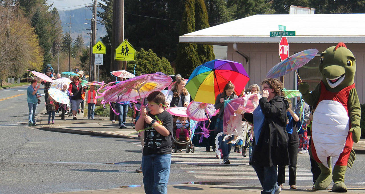 Below, the sun came out just as the annual umbrella parade got underway during RainFest on Saturday in Forks. Umbrella decorators worked on their creations that morning and then crossed Spartan Avenue and headed down Forks Avenue, parading all the way to Forks Outfitters where they enjoyed free root beer floats. The Olympic Peninsula Guides Association was set up at the store’s parking lot providing free river floats on the Sol Duc and Bogachiel rivers for most of the day. Other activities Saturday included art workshops and an art show at the Rainforest Arts Center, as well as the Fabric of the Forest Quilt Show. Activities continued Sunday.