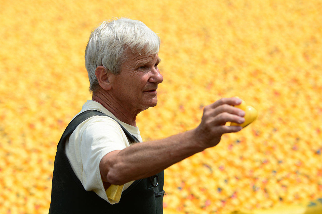 The race began as a dump truck full of rubber ducks, which was parked on the bank above the pond, upended its load.