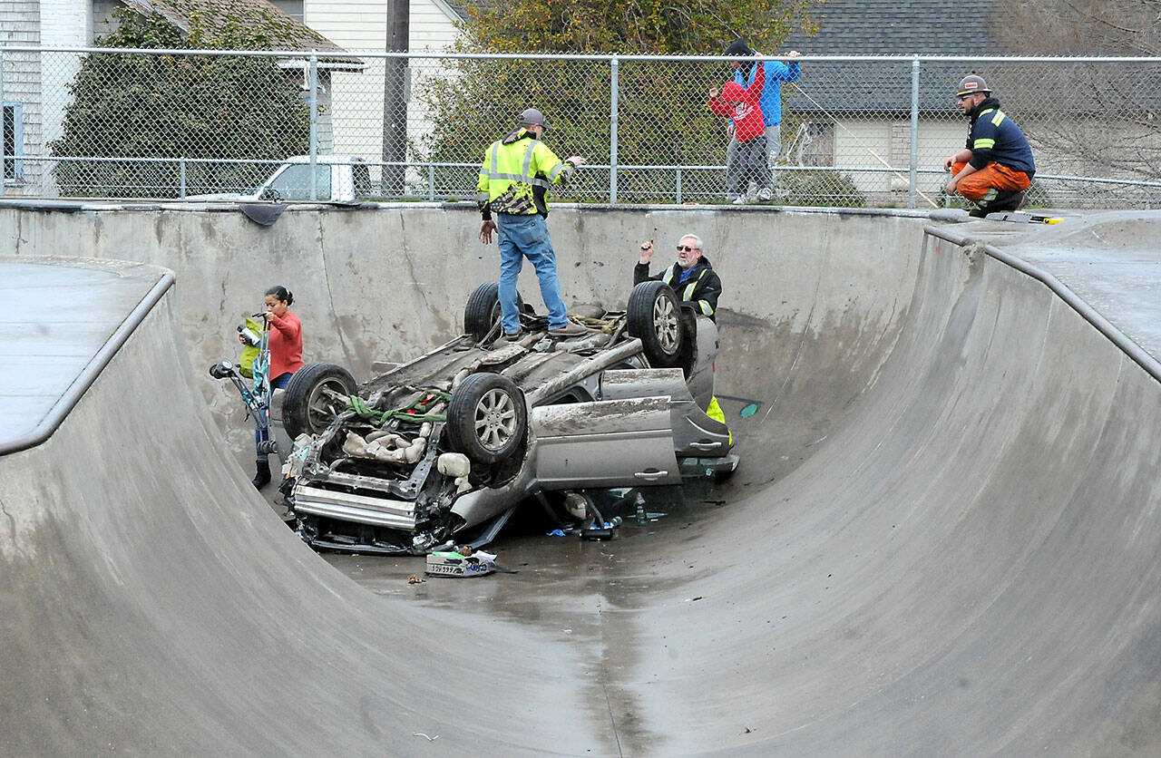 PORT ANGELES — Tow truck operators worked for about three hours Wednesday to lift a passenger car from the bottom of a Port Angeles Skate Park bowl where it had landed on its roof.