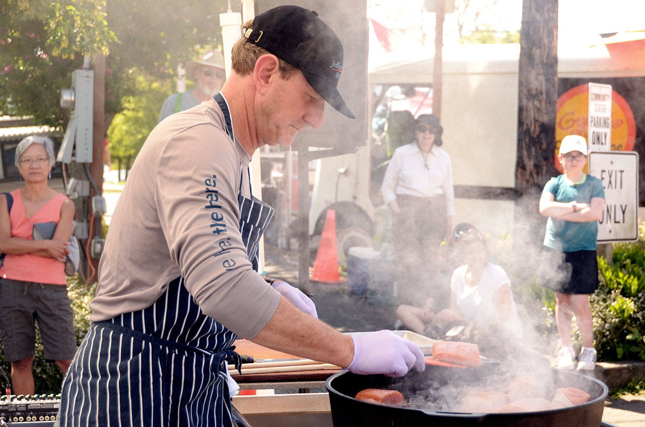 Arran Stark, the executive chef at Jefferson Healthcare hospital, cooked seared salmon topped with spicy cabbage at the Saturday farmers market in uptown Port Townsend.