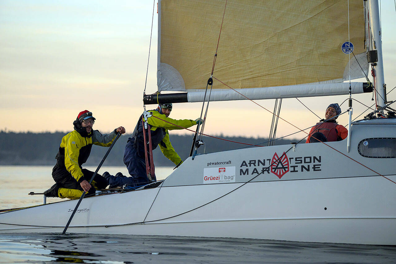 PORT TOWNSEND — Port Townsend-based sailing team Puget Sound Navigation Company sailed victorious across the WA360 boat race finish line early Tuesday morning, breaking the course record by a half of a day.