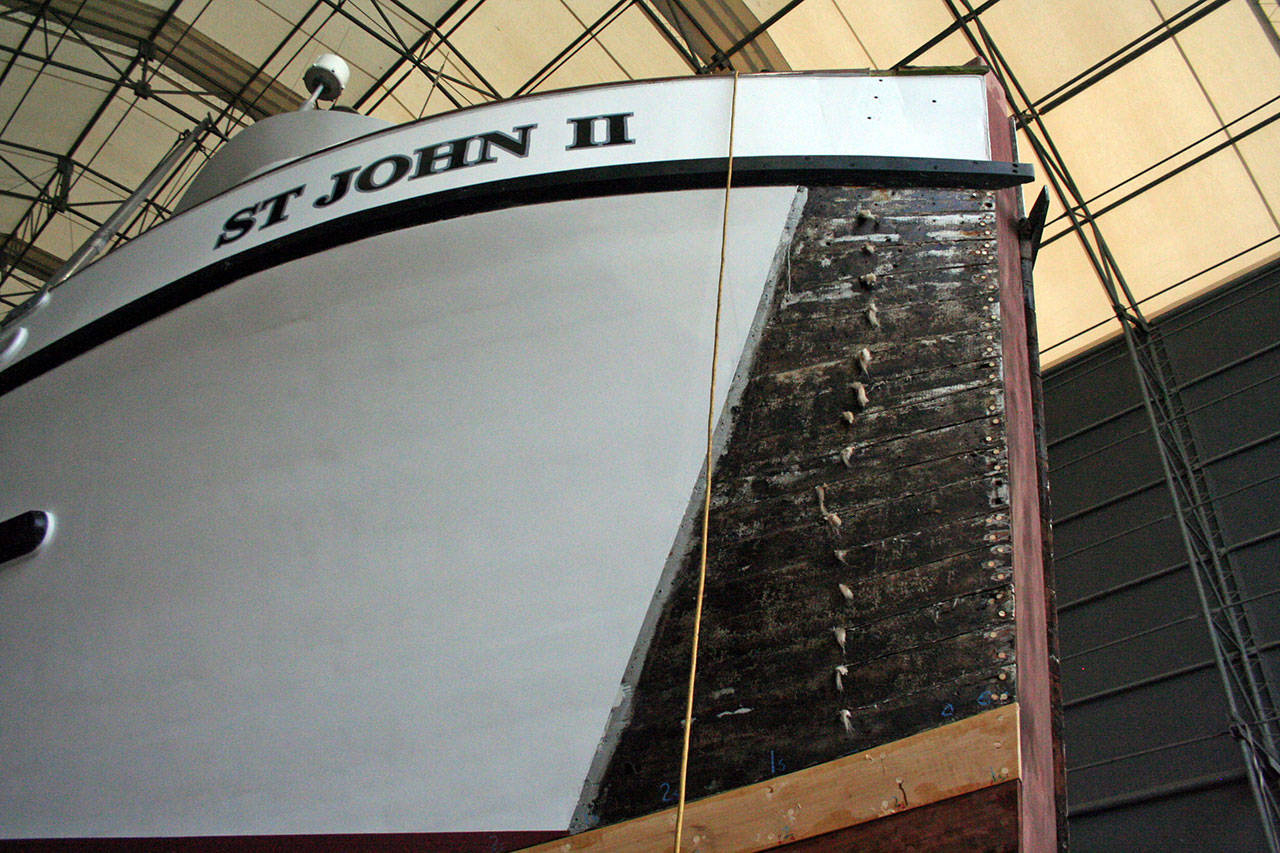 The Western Flyer, made famous by John Steinbeck and Ed Ricketts in the book “Sea of Cortez: A Leisurely Journal of Travel and Research,” fills up one of the rooms. Jordan Bard and Greg Friedrichs worked Monday on tightening several boards during the ongoing restoration project.