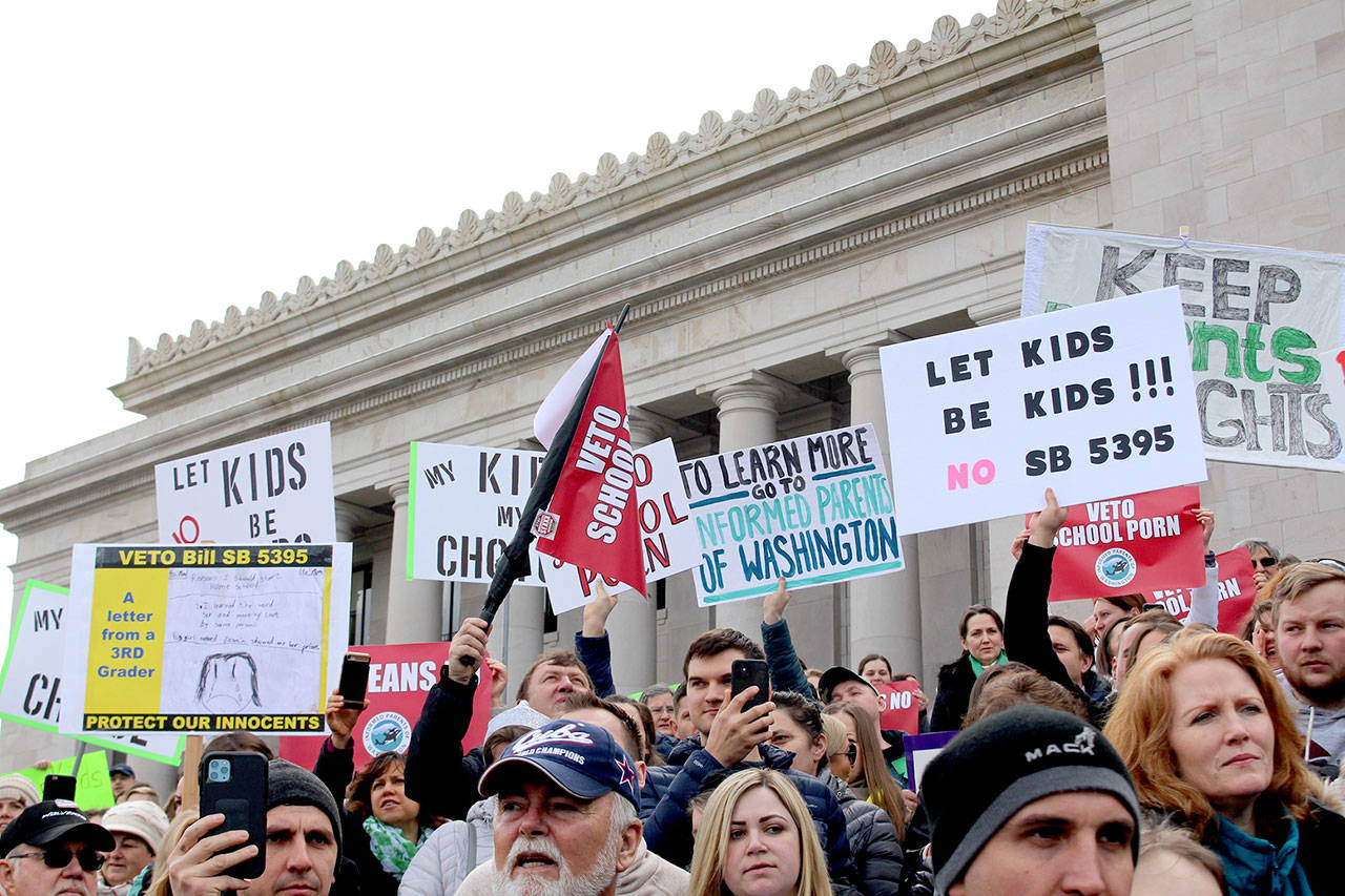 OLYMPIA — Despite the governor’s warning to avoid crowds in the wake of the coronavirus, hundreds of concerned parents and residents converged on the Capitol to protest Saturday’s passage of a law to mandate comprehensive sex education from kindergarten through 12th grade in the state of Washington.