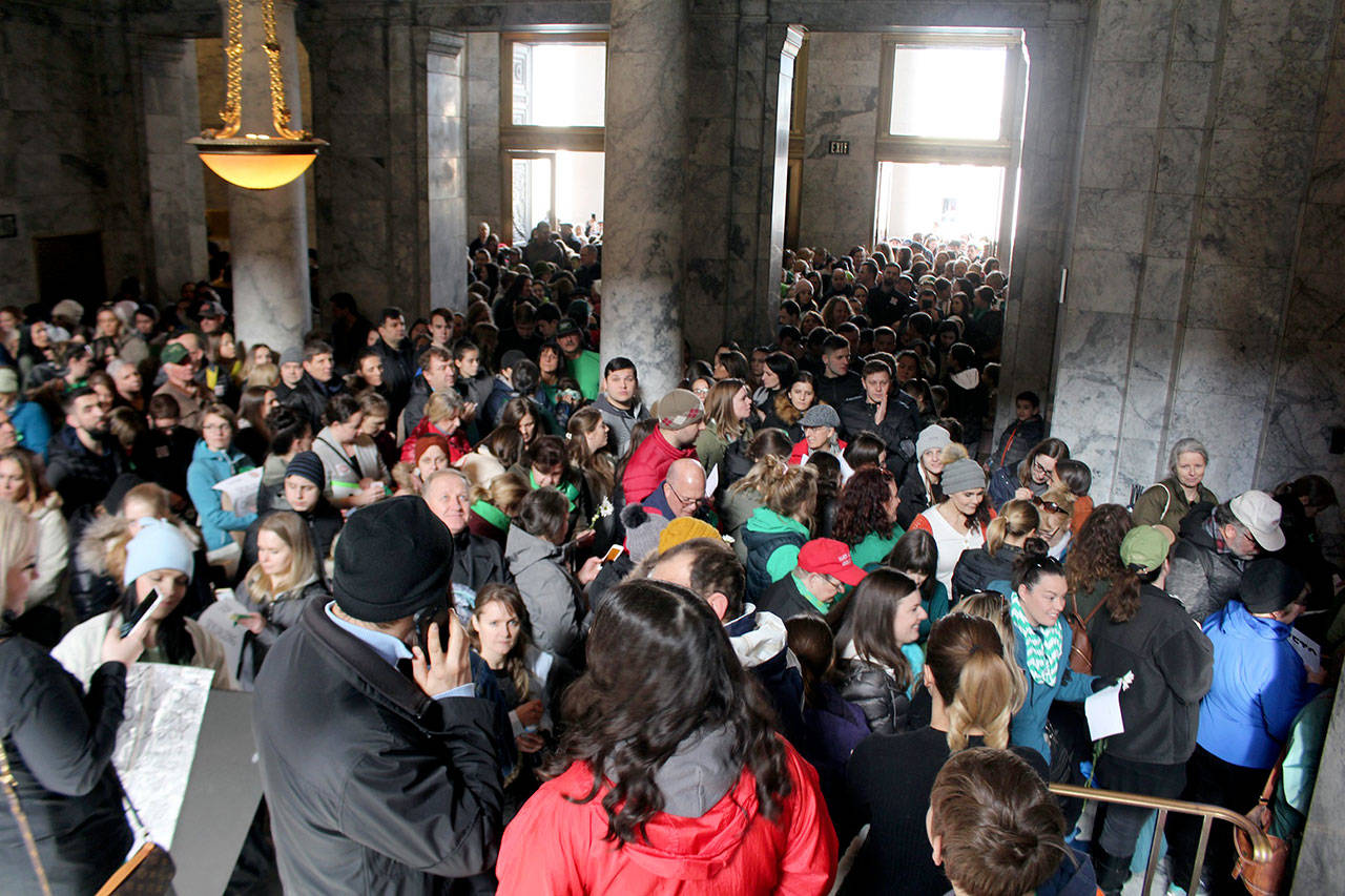 After a series of speeches from advocates and legislators, the throng of protestors crowded the halls outside the governor’s office as they waited to leave written comments with Inslee’s staff.