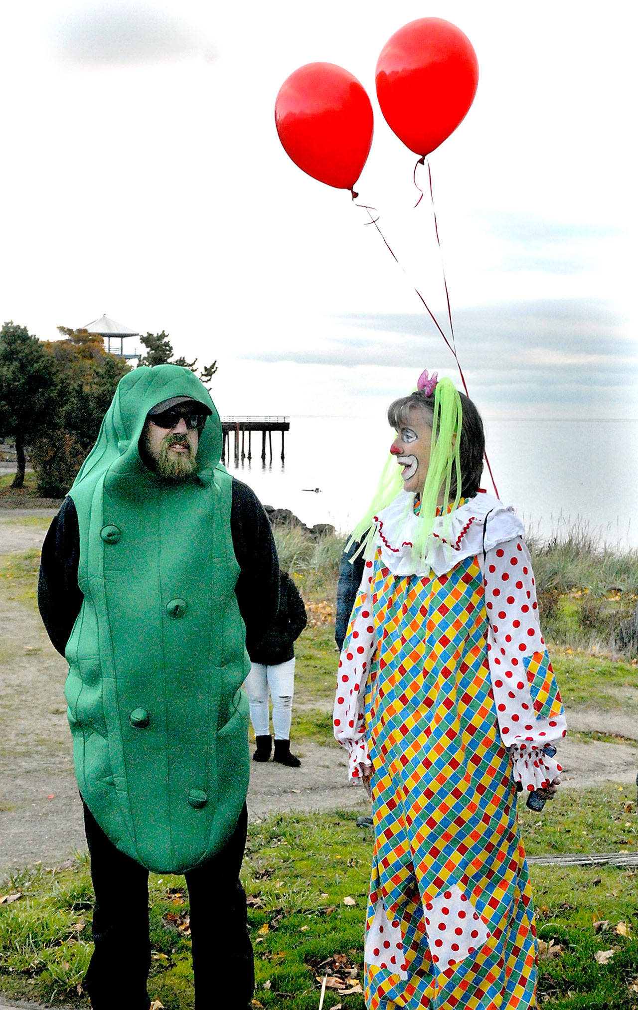 Richard Drake, pickle, and clown Cheryl Morgan, both employees of Swain’s General Store in Port Angeles, wait at the start of the 5K event.