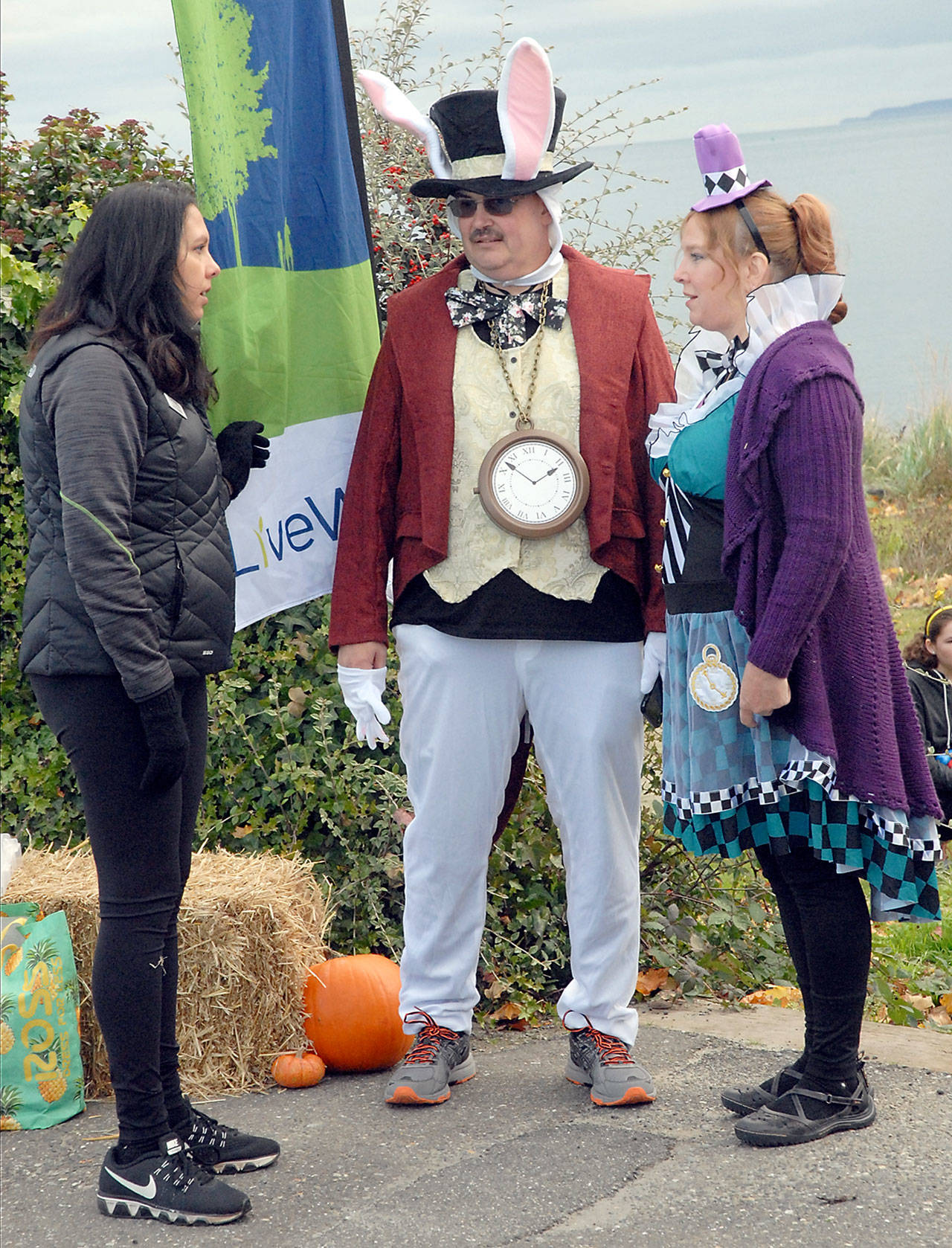 While Sara Scheib, Sound Health & Wellness Trust, left, speaks with white rabbit George Oplinger and hatter Trudi Loertscher, both of Olympia, before the start of Saturday’s Pumpkin Fun Run.