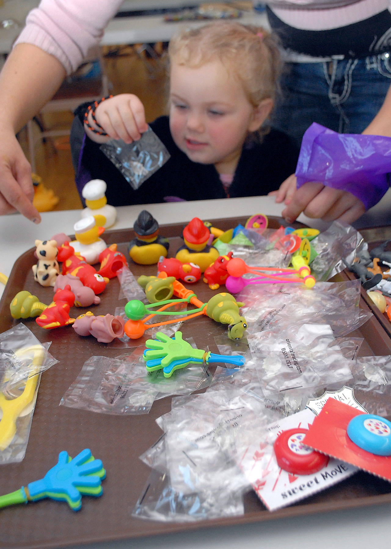 Two-year-old Zoey Luciano of Port Angeles picks a Halloween prize from a tray filled with trinkets as her mother, Stephaine Weiss, helps with the choice during Saturday’s Pumpkin Party. (Keith Thorpe/Peninsula Daily News)