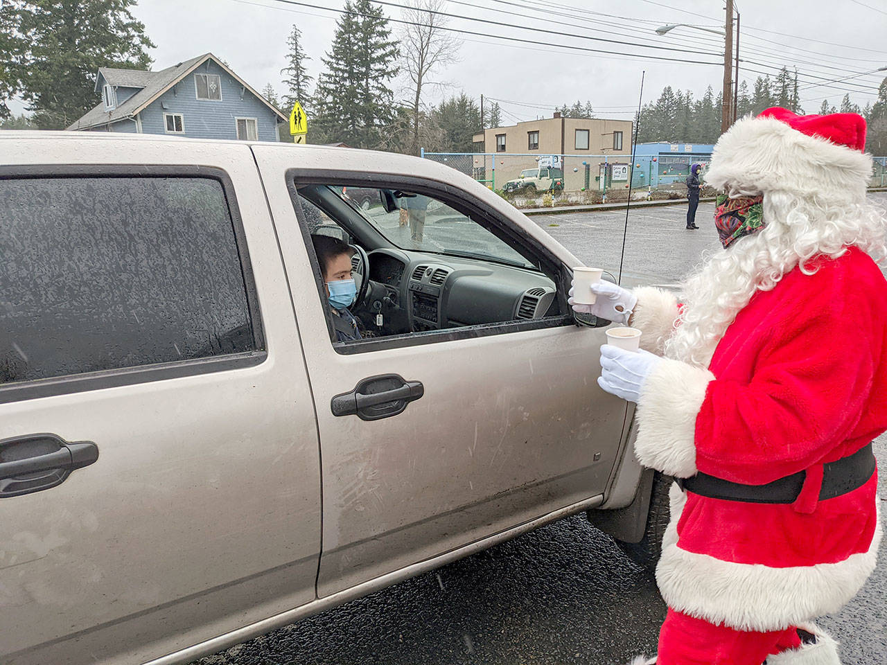 QUILCENE — Pouring rain, Christmas music and passing work and semi-trucks honking in support accompanied a giveaway of throw blankets, hot chocolate, candy canes and hand sanitizer to Quilcene School District students.