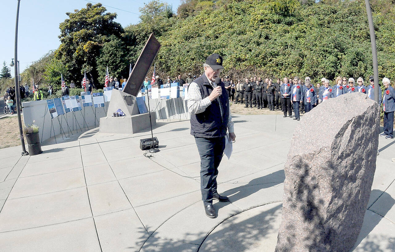 Division Chief Tyler Gage of the Port Angeles Fire Department delivers remarks how firefighters and first responders were affected by the events of Sept. 11, 2001, during a remembrance ceremony on Thursday at the twin monuments at 9/11 Memorial Waterfront Park in Port Angeles.