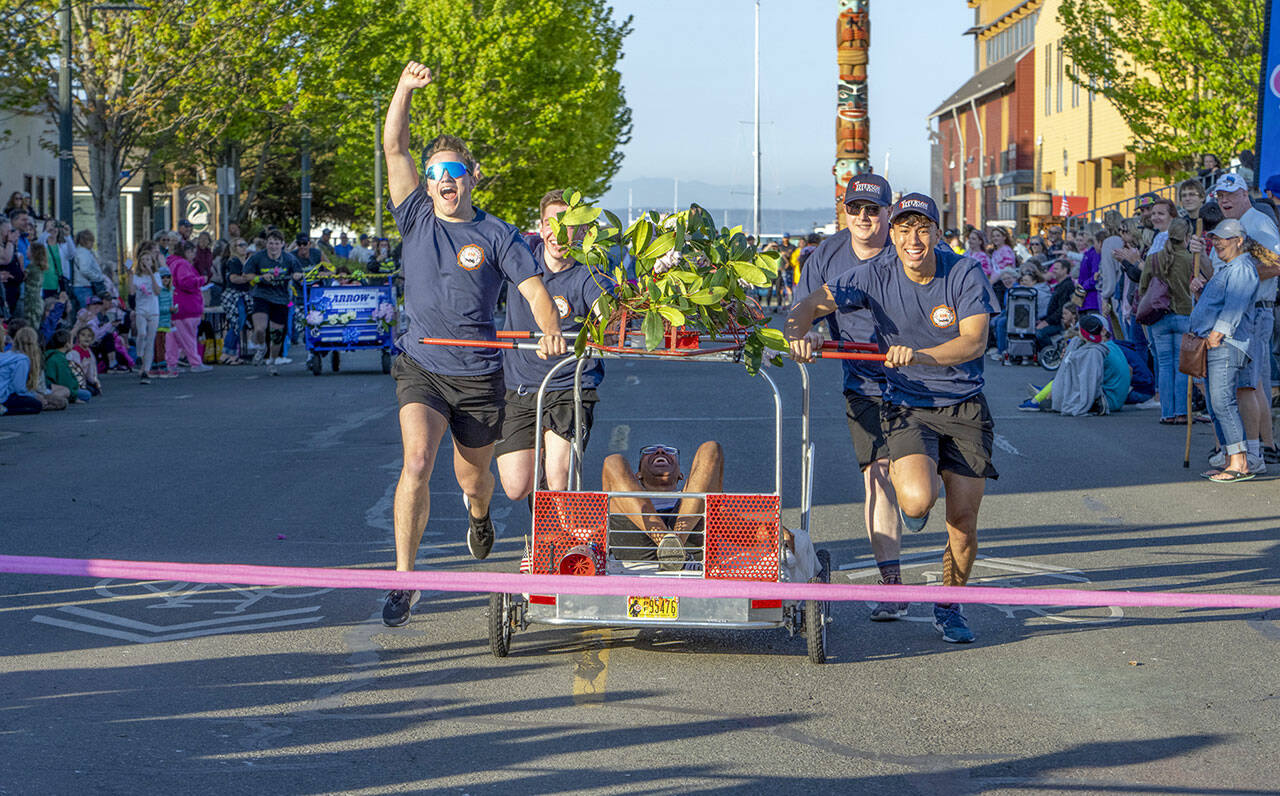 A team from East Jefferson Fire and Rescue jubilantly crosses the finish after overpowering the team from Arrow Lumber and Hardware to go undefeated in the round-robin event and win the Bed Races during the 2023 Rhody Festival on Saturday in downtown Port Townsend. Each bed must have some semblance of a bed with a headboard and footboard and wheels. Four pushers and a rider weighing at least 100 pounds or more are also required. (Steve Mullensky/for Peninsula Daily News)