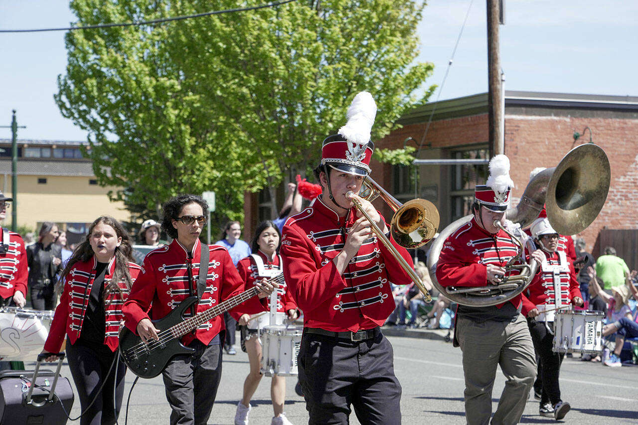 Members of the Port Townsend High School band perform while marching along Water Street in downtown Port Townsend on Saturday during the 2023 Rhody Parade. (Steve Mullensky/for Peninsula Daily News)