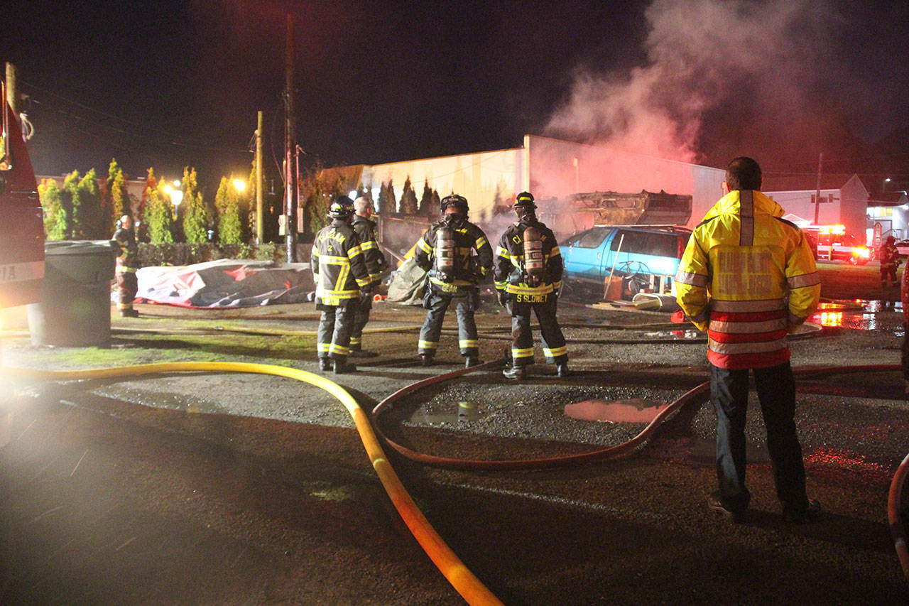 A Port Angeles firefighter douses hot spots on a recreational vehicle that caught fire near the alley behind Little Caesars Pizza, 1315 E. Front St., in Port Angeles on Tuesday evening.