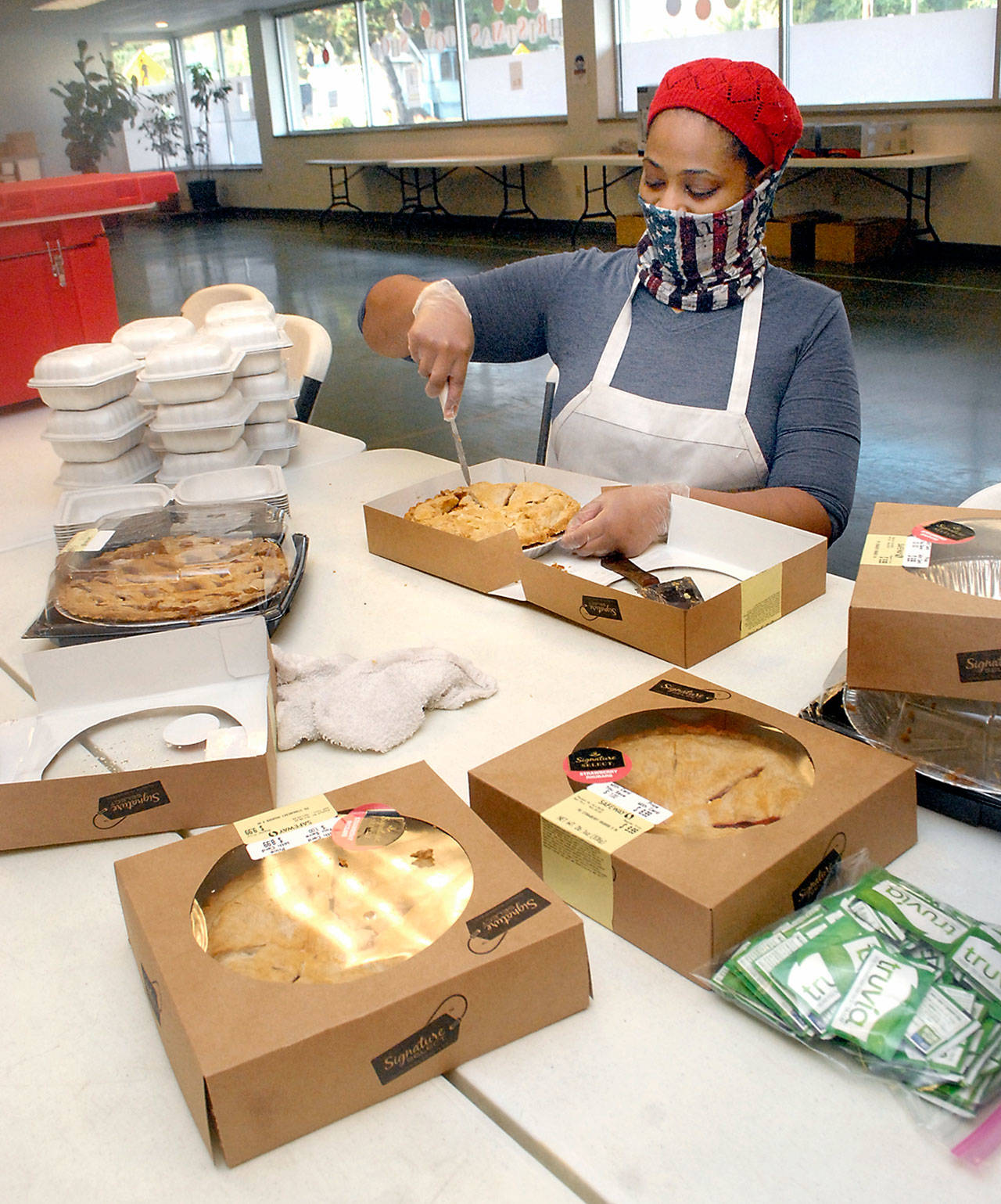 A staff of cooks worked to prepare a traditional dinner — or as traditional as possible — for carry-out service in clam-shell service containers.