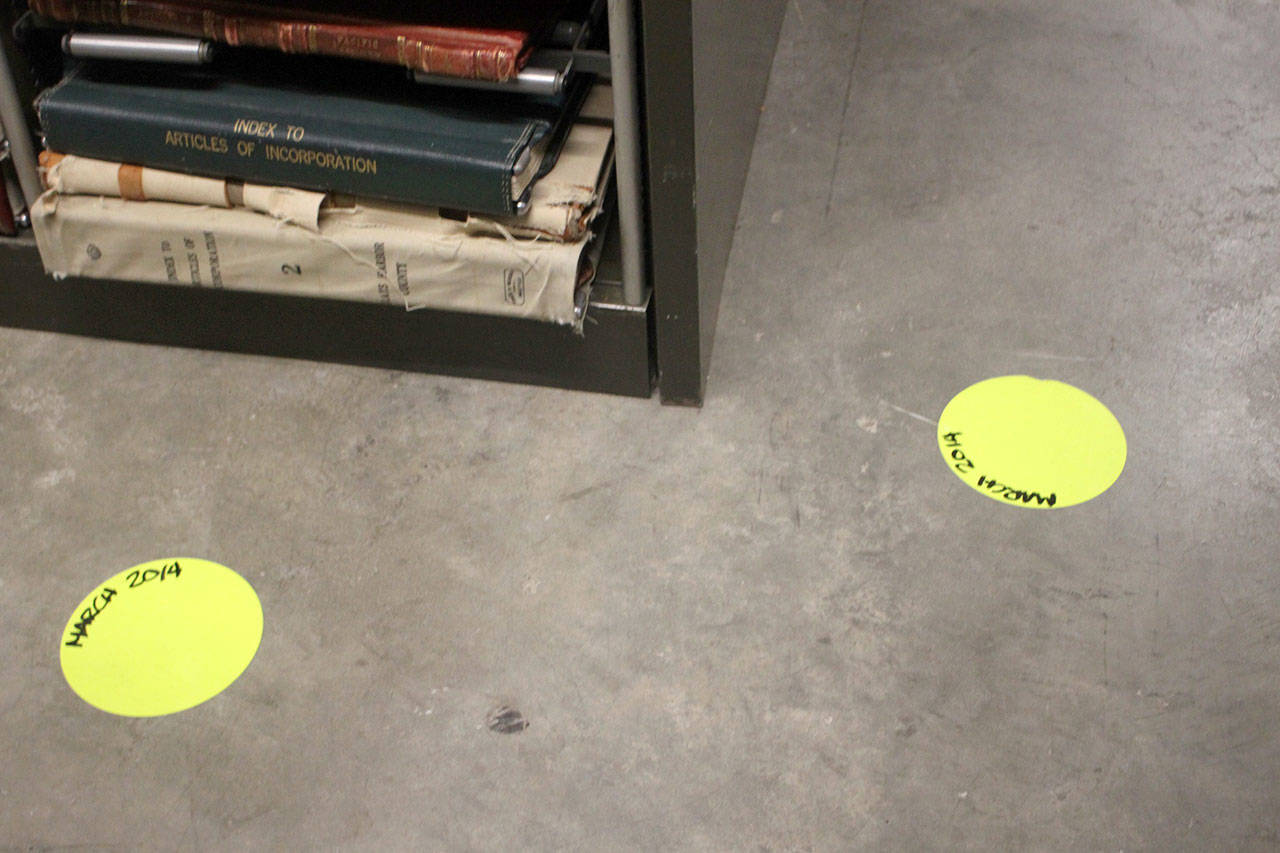 The water leaked through the floor and into the records rooms the floor below. In preparation of future incidents, staff placed markers on the floor where water had leaked.
