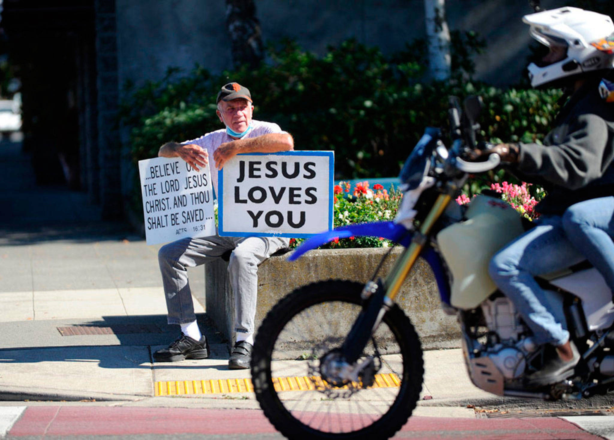 Nightingale began standing in late July with messages of scripture — Acts 16:31 (So they said, “Believe on the Lord Jesus Christ, and you will be saved, you and your household”) — following the lead of Jim Nichols of Sequim, who started holding signs on the Fourth of July.