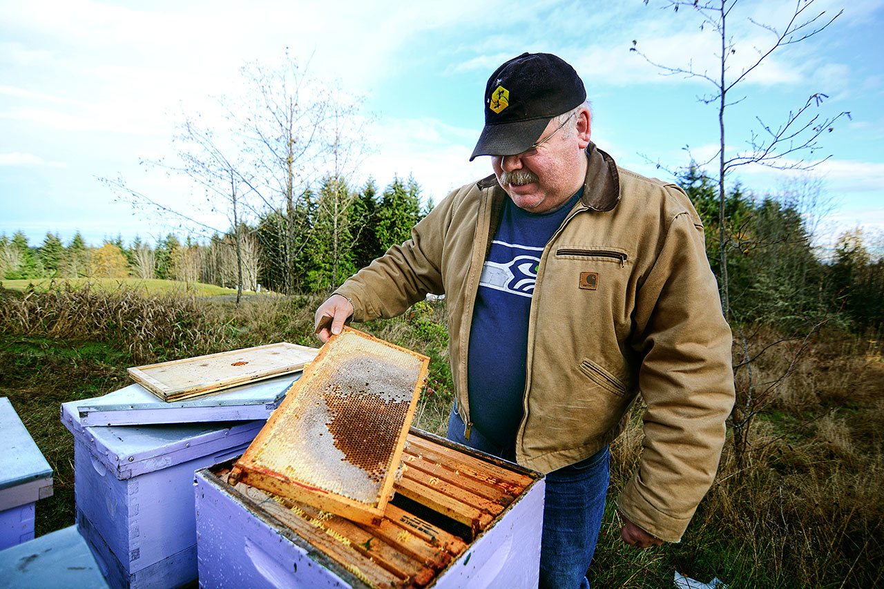 Buddy Depew, co-owner of Sequim Bee Farm, goes through his hives after someone poisoned about 20 of his hives. (Jesse Major/Peninsula Daily News)