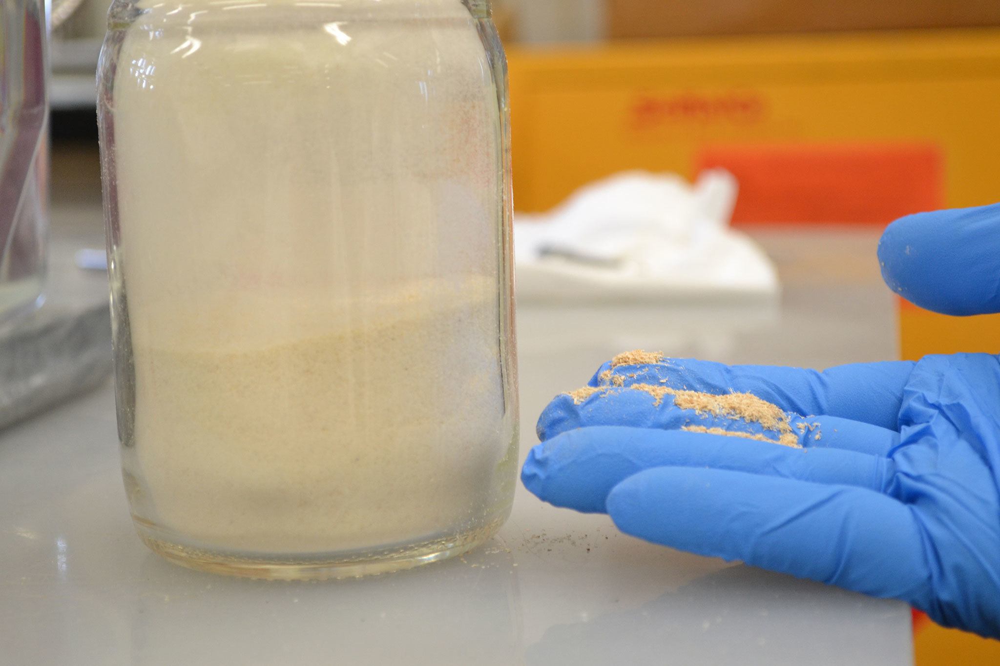 The aggregator is a wood flour — fine dust from wood processing — modified by chemists who attach oil-attracting chemicals to the surface, Bonheyo said.