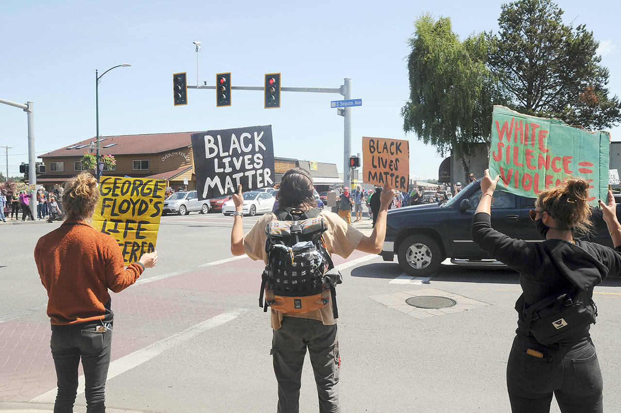From left, Mackenzie Grinnell, Peter Beeler and Jaiden Dokken hold signs at the corner of Washington Street and Sequim Avenue on Wednesday, protesting racism and the death of George Floyd and other Black men at the hands of police officers. (Michael Dashiell/Olympic Peninsula News Group)