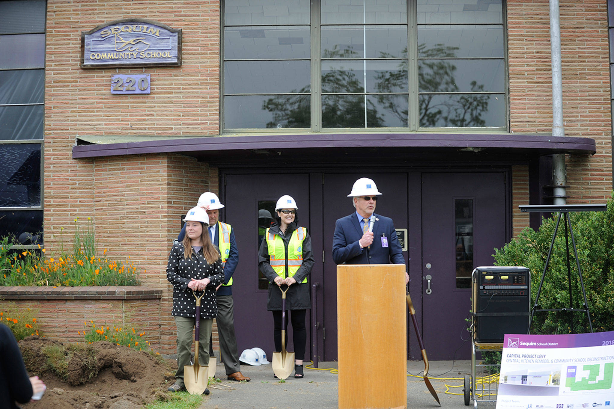 About 50 students, Sequim School District officials, school board and community members gathered Friday for a “capital project levy groundbreaking” ceremony at the Sequim Community School, as the district moves forward with building a new central kitchen and demolishing the unused portions of the school built in 1949.