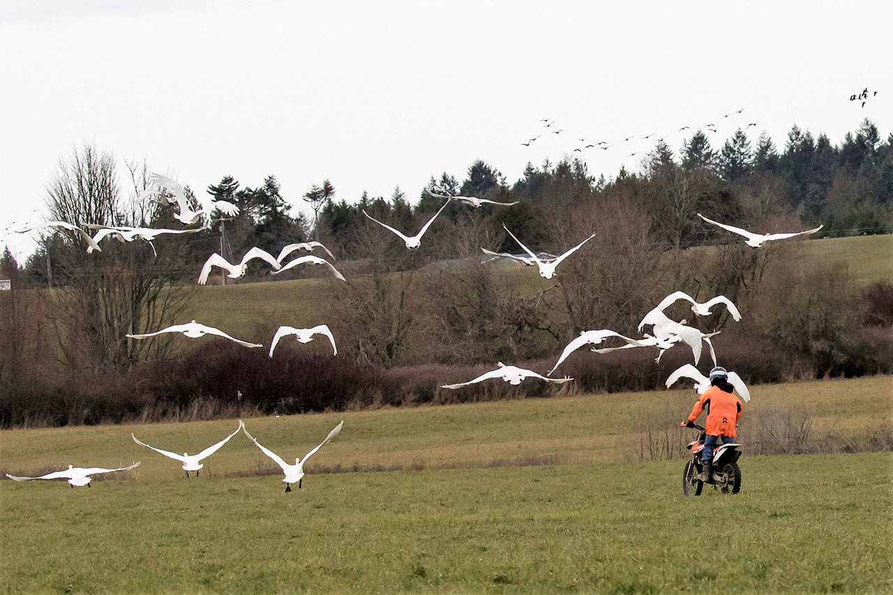 Ginger and Dan Poleschook of Live Loon Lake reported to law enforcement that more than 60 trumpeter swans were harassed in Dungeness on Jan. 6 by a child on a four-wheeler. The couple was visiting family and took some time to snap photos of the swans when they spotted the child. Ginger said the juvenile rode into the field and accelerated to scare the birds and some nearly flew into nearby power lines on Evans Road.