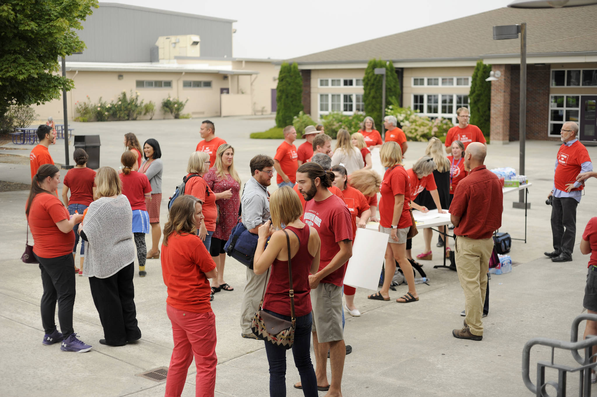 SEQUIM — A stream of red flowed from outside the Sequim High School auditorium and into the Sequim School Board room as teachers and supporters wearing red clothing crammed together to stand in solidarity for fair teacher pay.