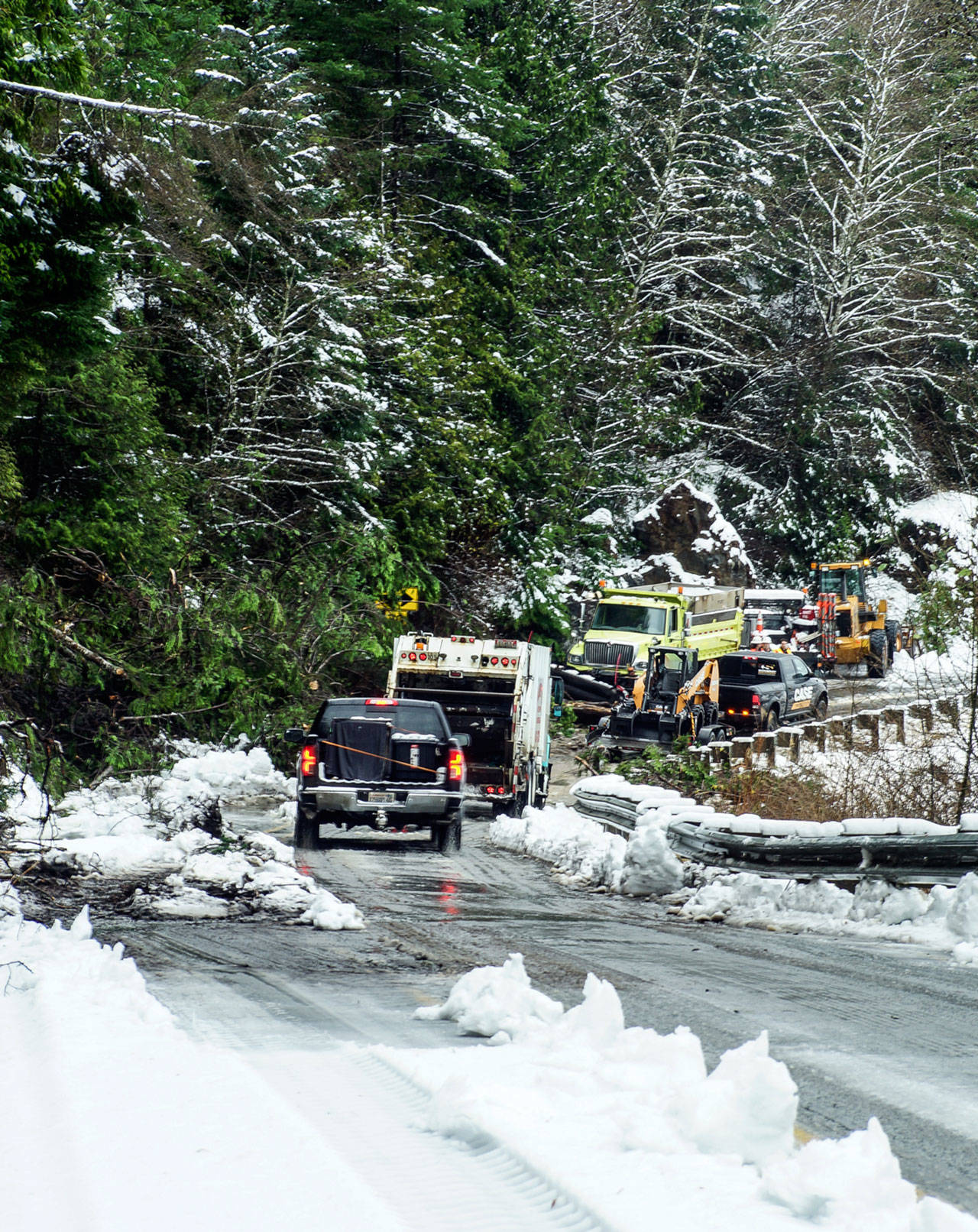 State and Clallam county road crews dug out roadways and Clallam County Public Utility District crews worked to reconnect electrical power customers at the northwest corner of the North Olympic Peninsula after a reported 9 inches to 12 inches of snow fell on the Sekiu-Clallam Bay area overnight Monday.