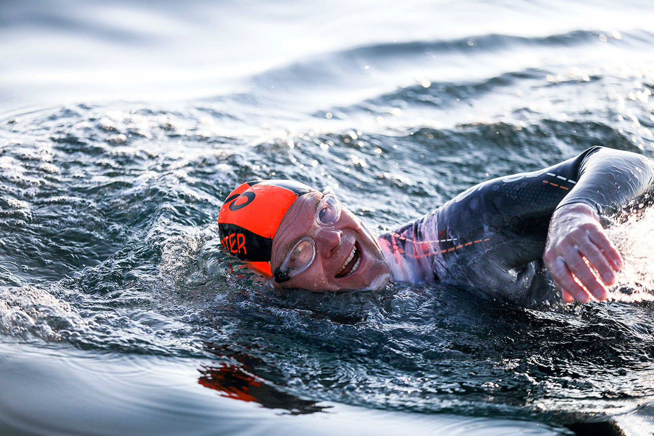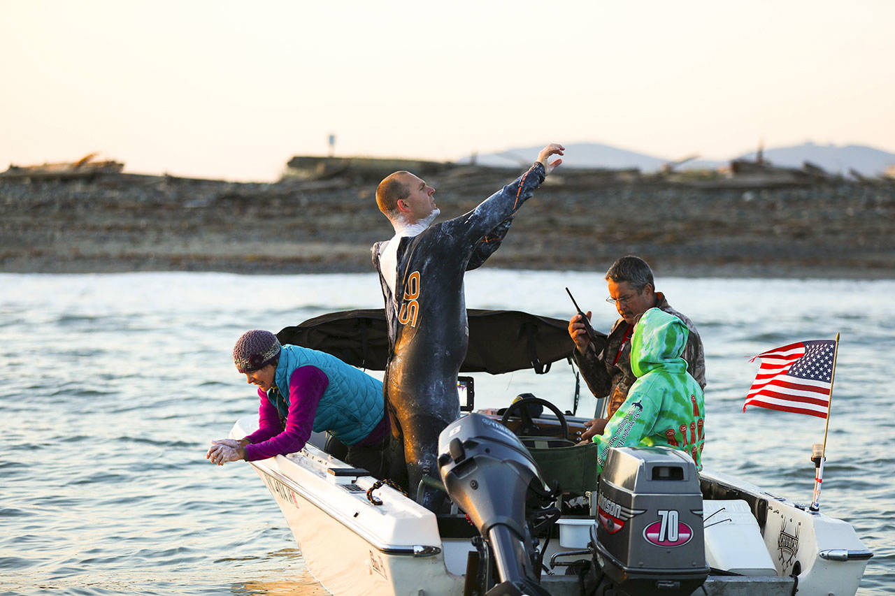 DeCou, 37, began Saturday’s swim from Dungeness Spit at 6:02 a.m. with great weather, his crew reported — “clear skies, minimal wind and 1-foot swells.”
