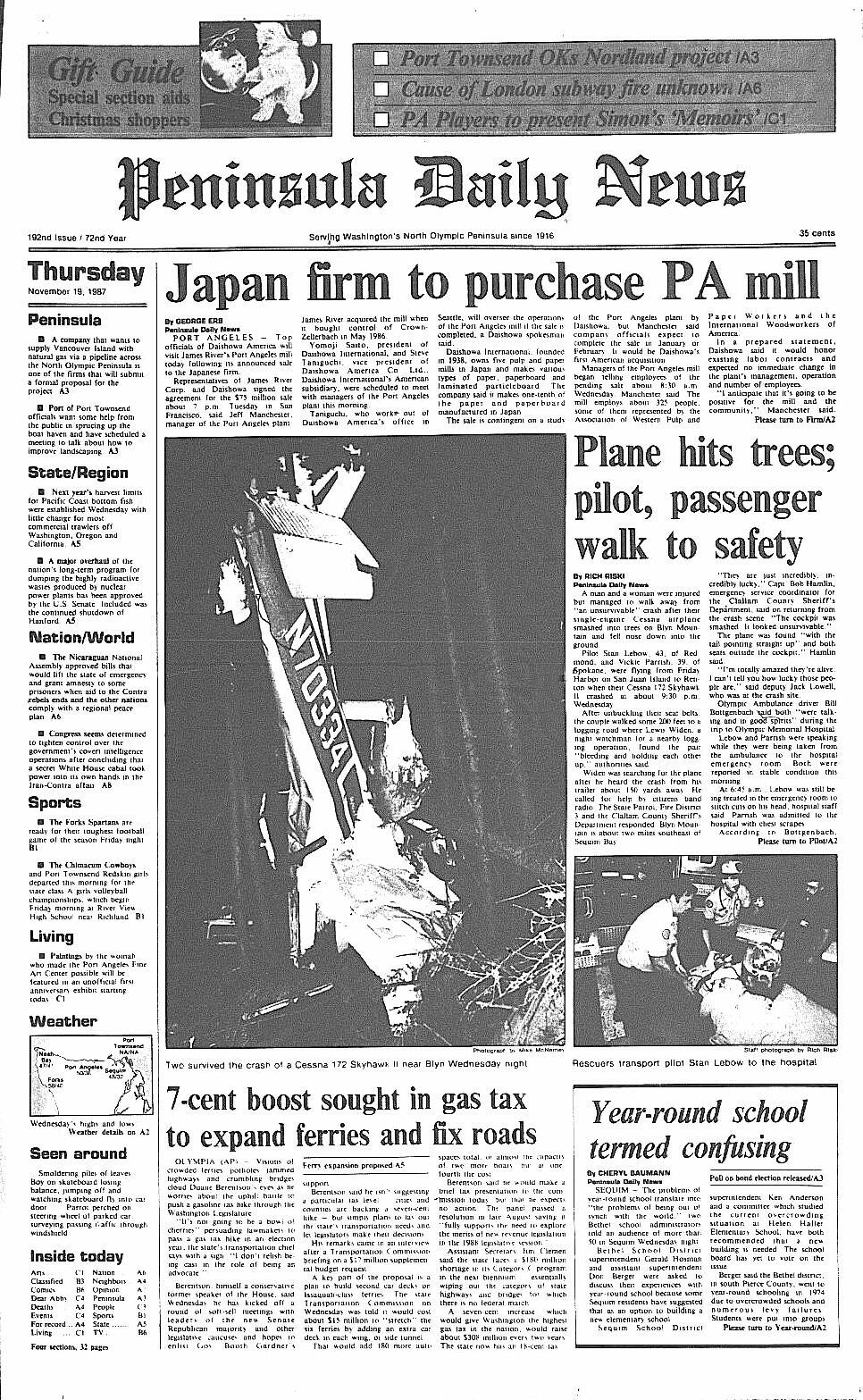 Parrish was one of the two people who survived the crash of a small plane on the side of Blyn Mountain, which straddles the Clallam and Jefferson county line on the Miller Peninsula southeast of Sequim Bay.