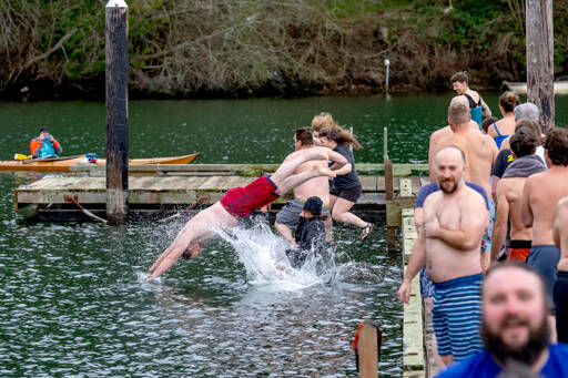 About 20 people took to the waters of Lake Pleasant on New Year’s morning at the Clallam County park during the Polar Bear plunge. (Lonnie Archibald/for Peninsula Daily News)