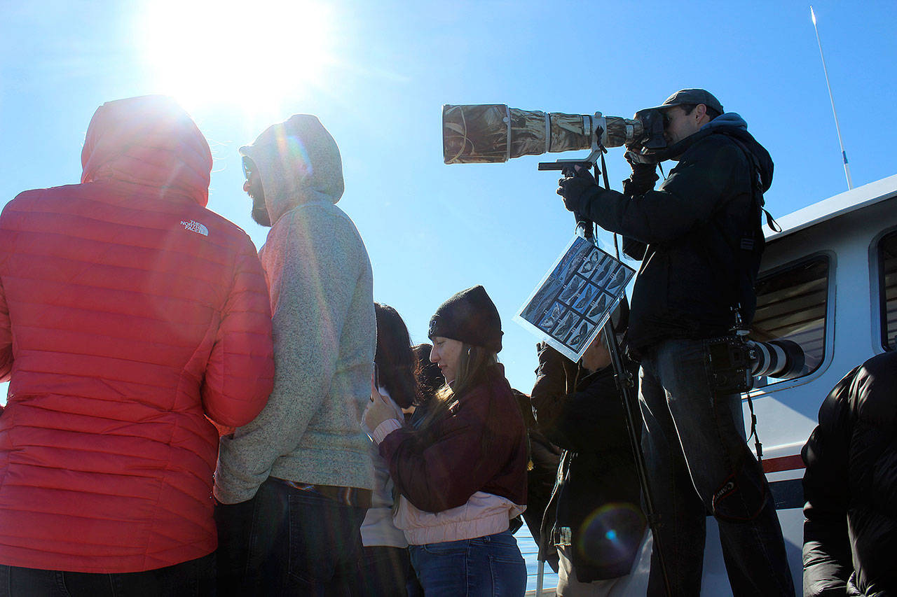 Out on deck surrounded by eager customers with tiny cellphones at the ready, Rulon explains the first clue to spotting a gray whale is spotting the spout, or blow, off in the distance.